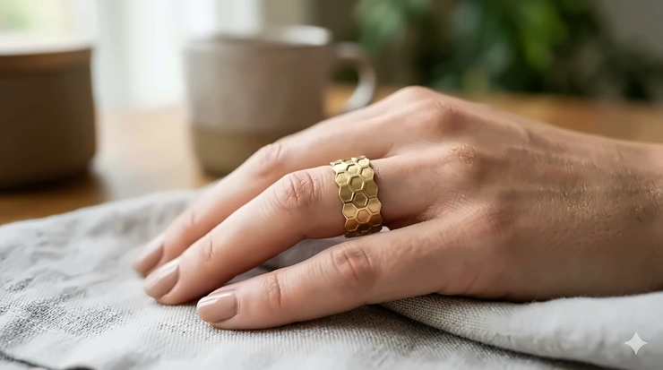 The construction quality here separates handmade from manufactured. Adorn512 uses either 14k gold-fill or sterling silver, both hand-finished to prevent the sharp edges that plague cheaper geometric rings. Gold-fill contains 100x more gold than gold-plating, bonded through heat and pressure rather than electroplating—it won’t flake or wear off even after years of daily wear. The hammered texture serves practical purpose beyond aesthetics: it hides the micro-scratches that inevitably accumulate on polished jewelry, keeping the ring looking pristine without constant buffing.